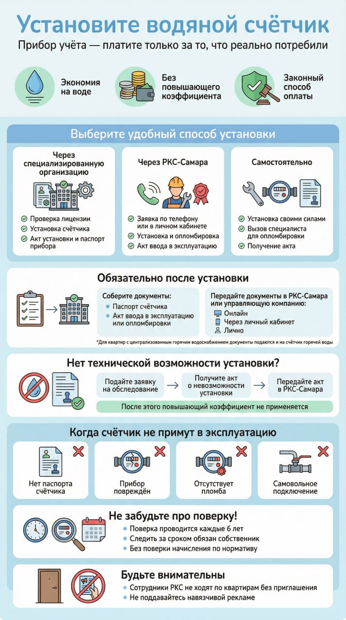 Помните, что сотрудники «РКС-Самара» не ходят по квартирам (только по вашему приглашению или по приглашению УК), не проводят отборы воды, не предлагают установить приборы учёта. Контроль за потреблением воды – обязанность абонента. Не переплачивайте за потребленные услуги. Устанавливайте и следите за своими приборами учёта. Осознанно выбирайте компанию по установке приборов учёта. Не поддавайтесь на навязчивую рекламу.
