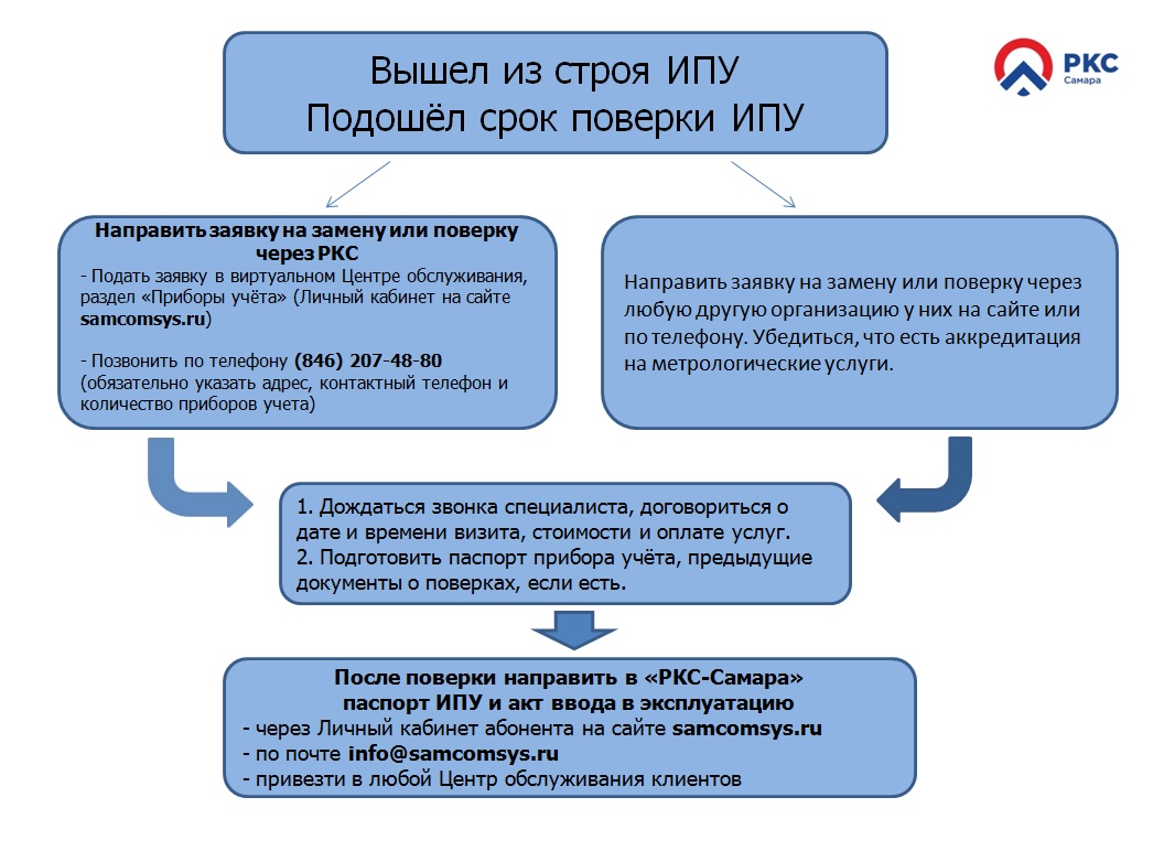 Чтобы провести поверку, необходимо заблаговременно, лучше, как минимум за месяц, обратиться в РКС-Самара по т. 207-48-80 или через личный кабинет https://lk.roscomsys.ru/login, или любую аккредитованную компанию. Поверка ранее действующего прибора учета – услуга платная.