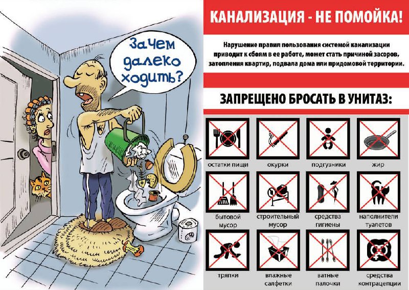 Большая часть засоров по-прежнему возникла из-за нарушения правил эксплуатации канализации. К сожалению, некоторые жители МКД используют унитазы и раковины как мусорки, сбрасывая туда обычные бытовые отходы. Но канализация – это система ВОДОотведения, она спроектирована для транспортировки только сточной ВОДЫ с ЕСТЕСТВЕННЫМИ отходами жизнедеятельности человека. (Они просто растворяются, пока текут по трубам)