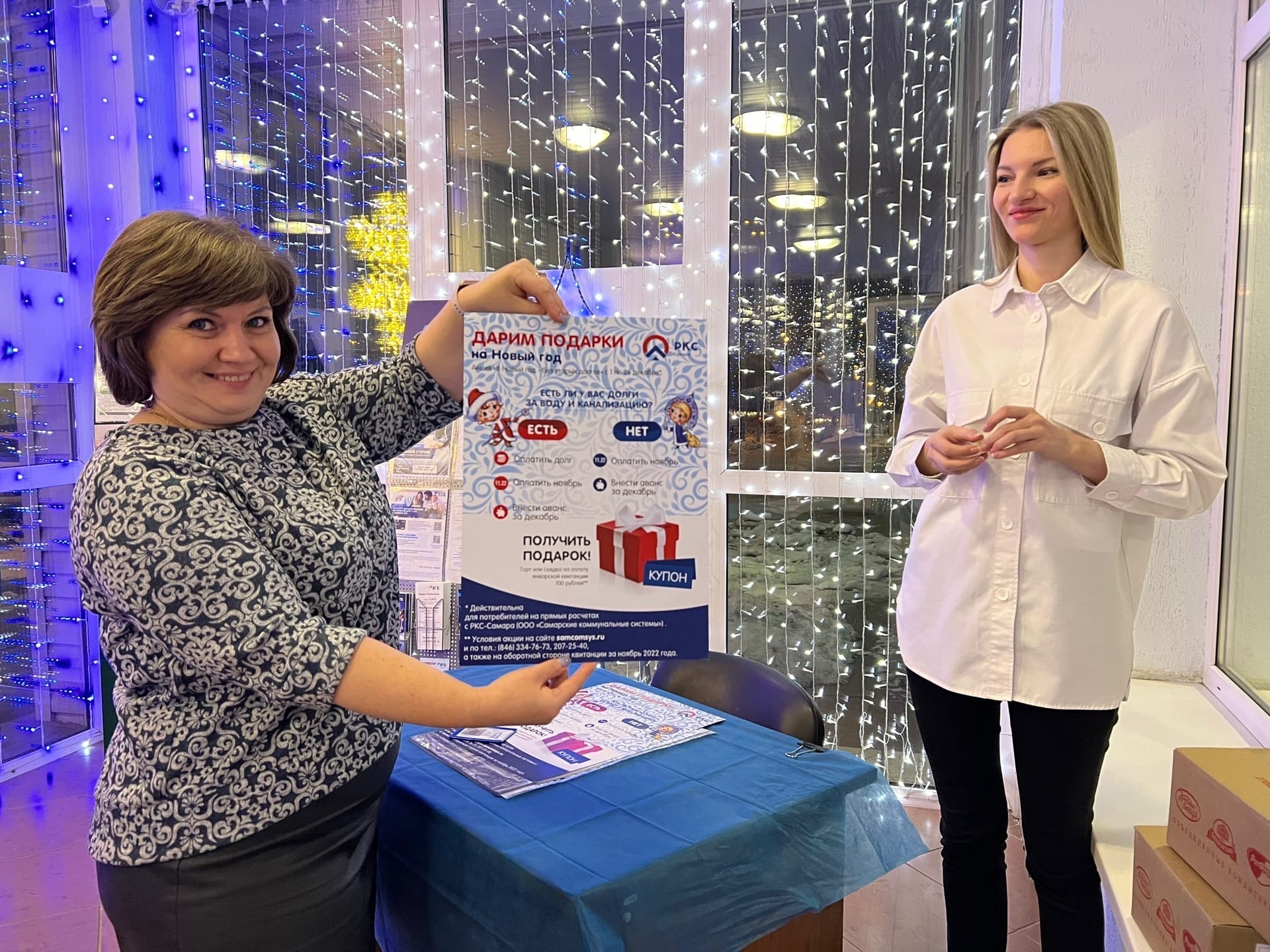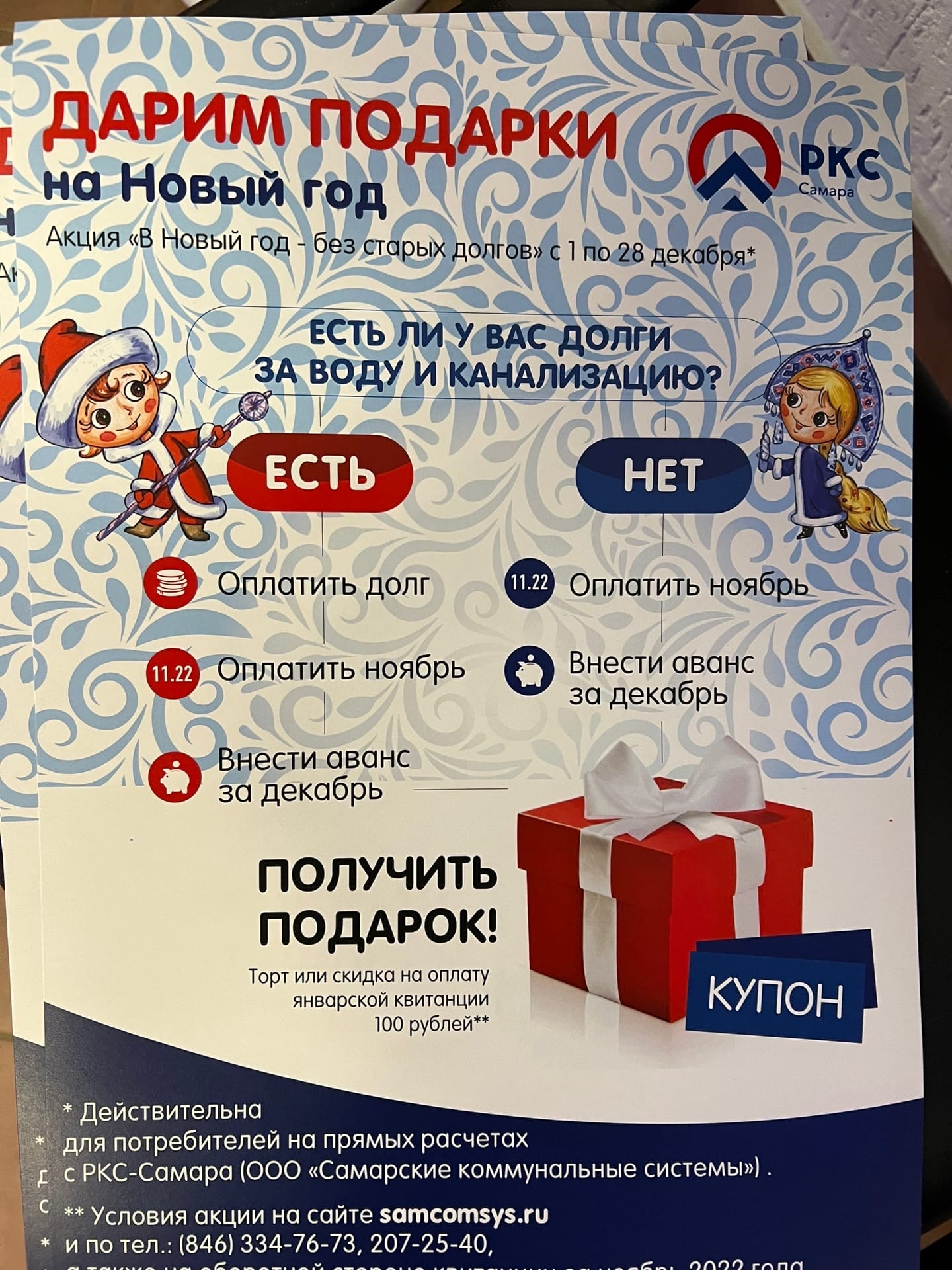 С первого дня зимы в «РКС-Самара» началась традиционная новогодняя акция «В Новый год - без старых долгов». Условия просты и неизменны несколько лет: оплатить все квитанции за холодное водоснабжение и водоотведение и внести аванс в размере оплаты за декабрь. Дальше можно получить сладкий приз или скидку в 100 рублей на будущий платёж за январь.