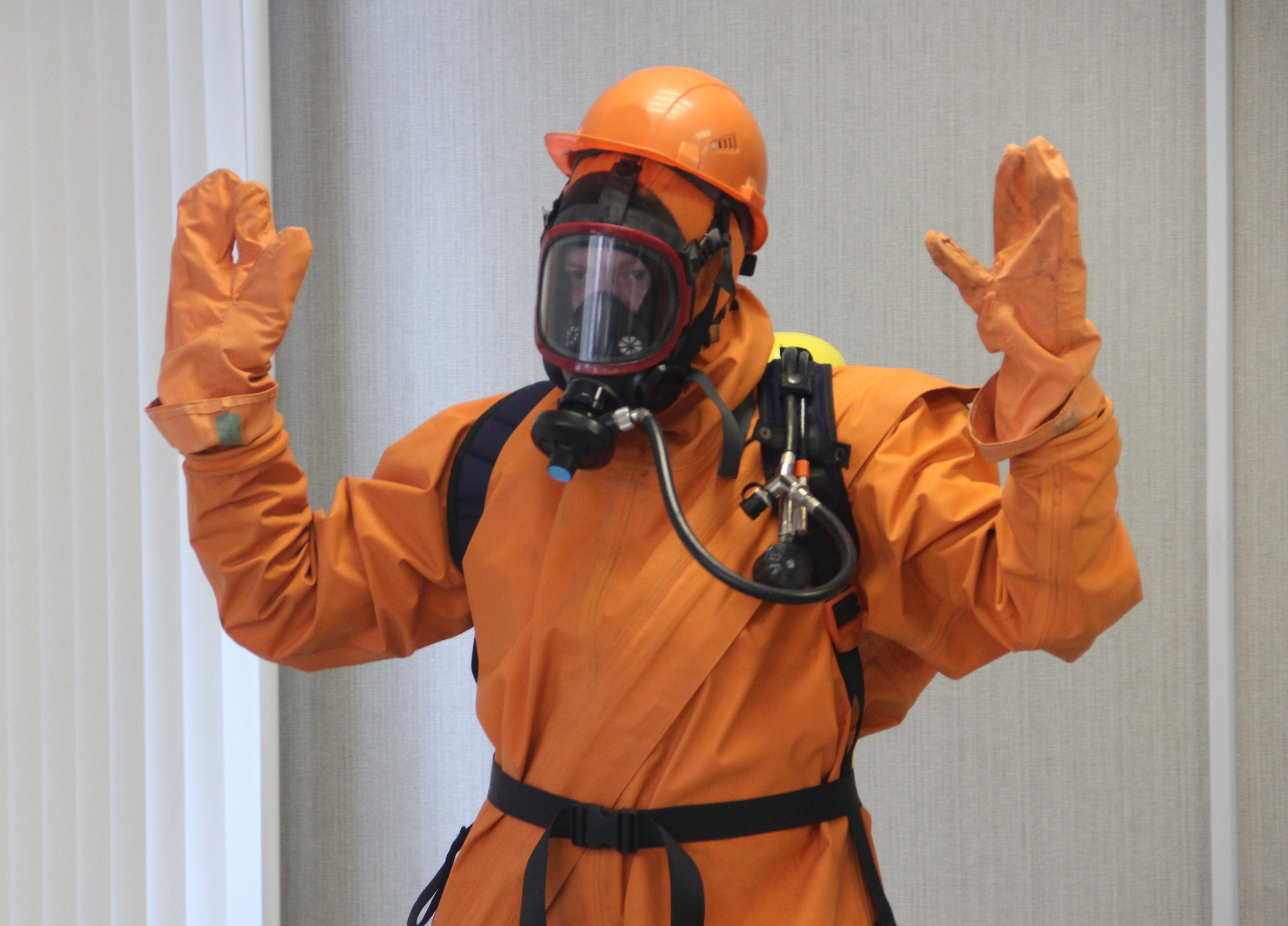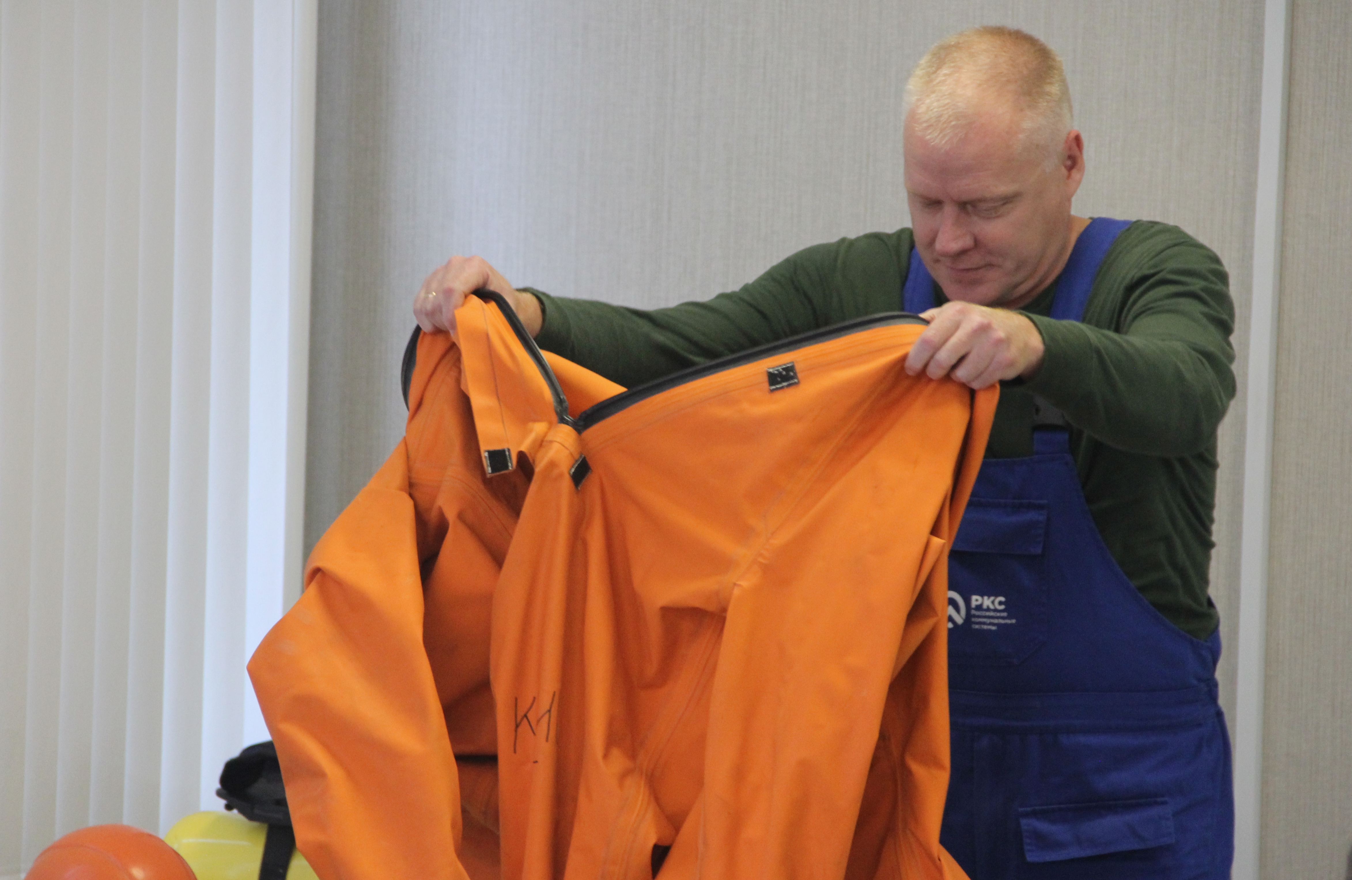 Облачение в специализированные костюмы – одна из важных составляющих при работах по ликвидации аварийных ситуаций, связанных с хлорным хозяйством. Расчётное время надевания костюма газохимической защиты и изолирующего дыхательного аппарата – 5 минут. Важно сделать всё не только быстро, но и правильно - что и удалось Максиму Ларионову.
