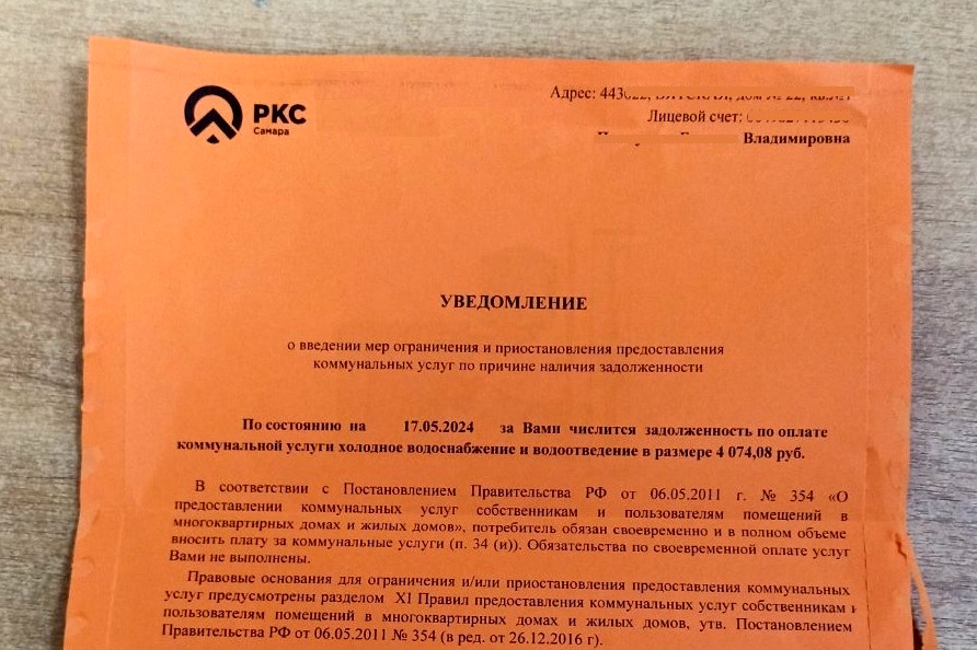 Любой из 43 тысяч самарцев, не оплативших квитанции «РКС-Самара», может остаться без канализации. Соответствующие уведомления об отключении услуги ресурсная компания направила абонентам-должникам. Чтобы и это предупреждение не осталось без внимания, информацию напечатали на ярко-оранжевой бумаге.